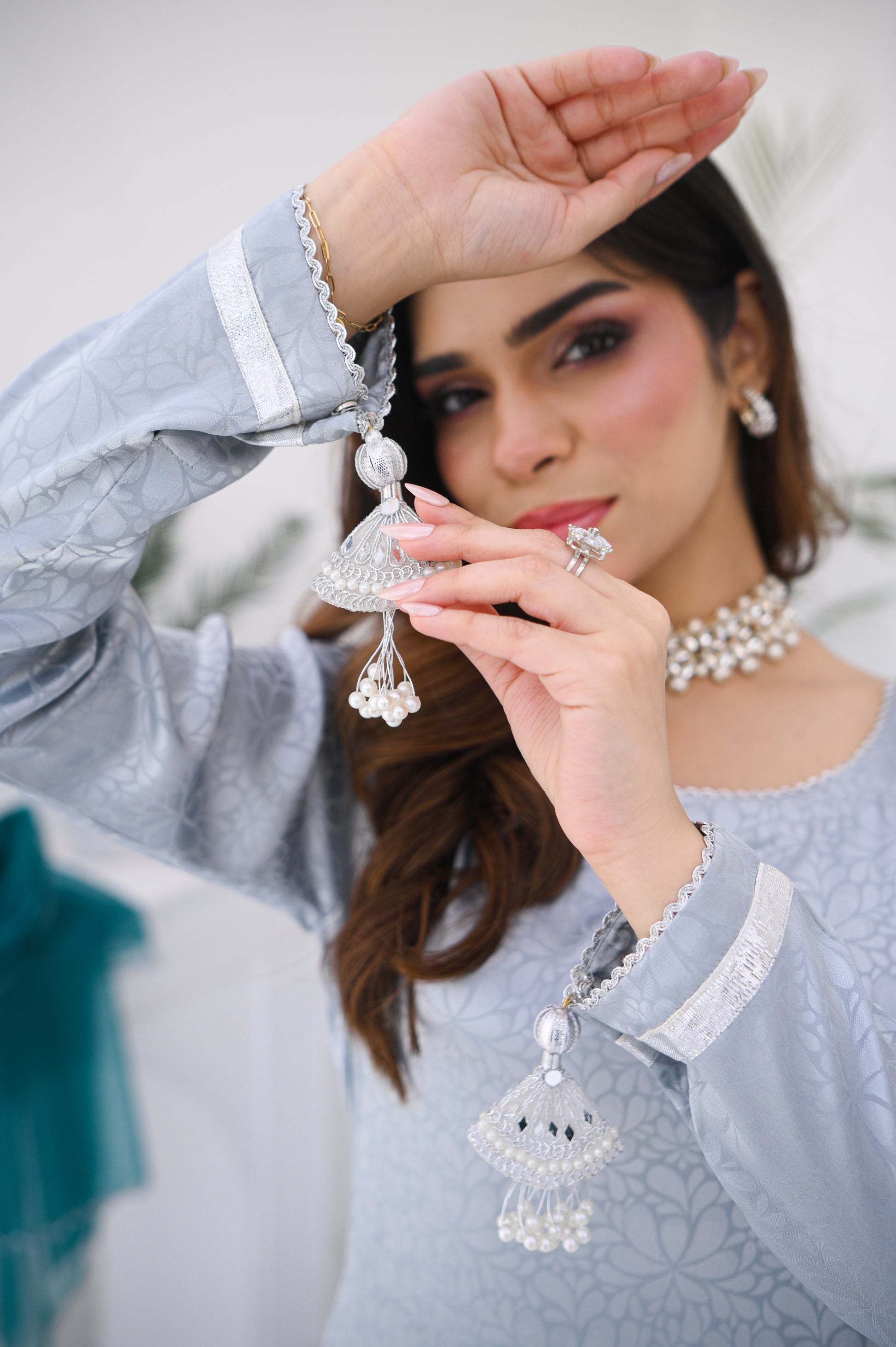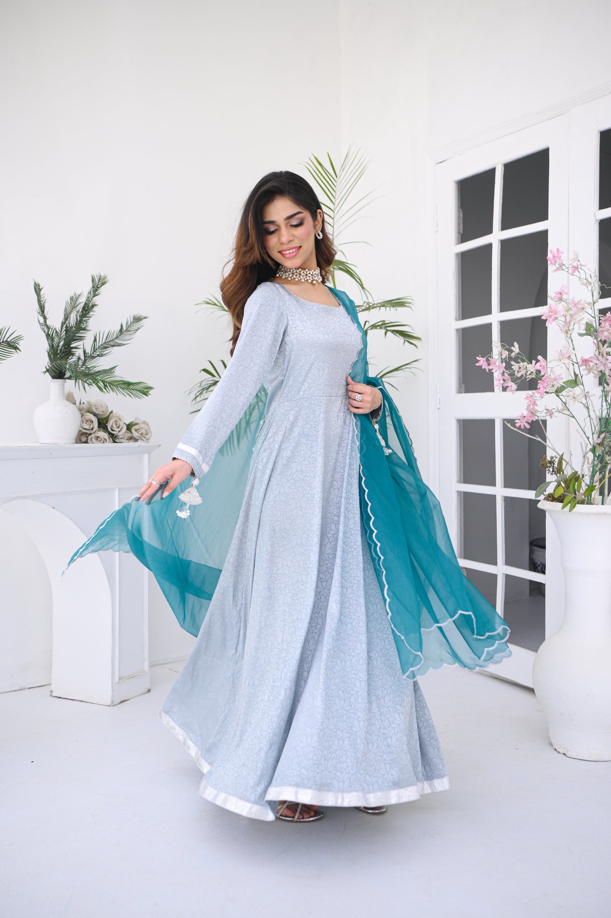 A delicate two piece featuring long maxi frock with lace details on sleeves and neckline paired up with embroidered scallop organza dupatta.