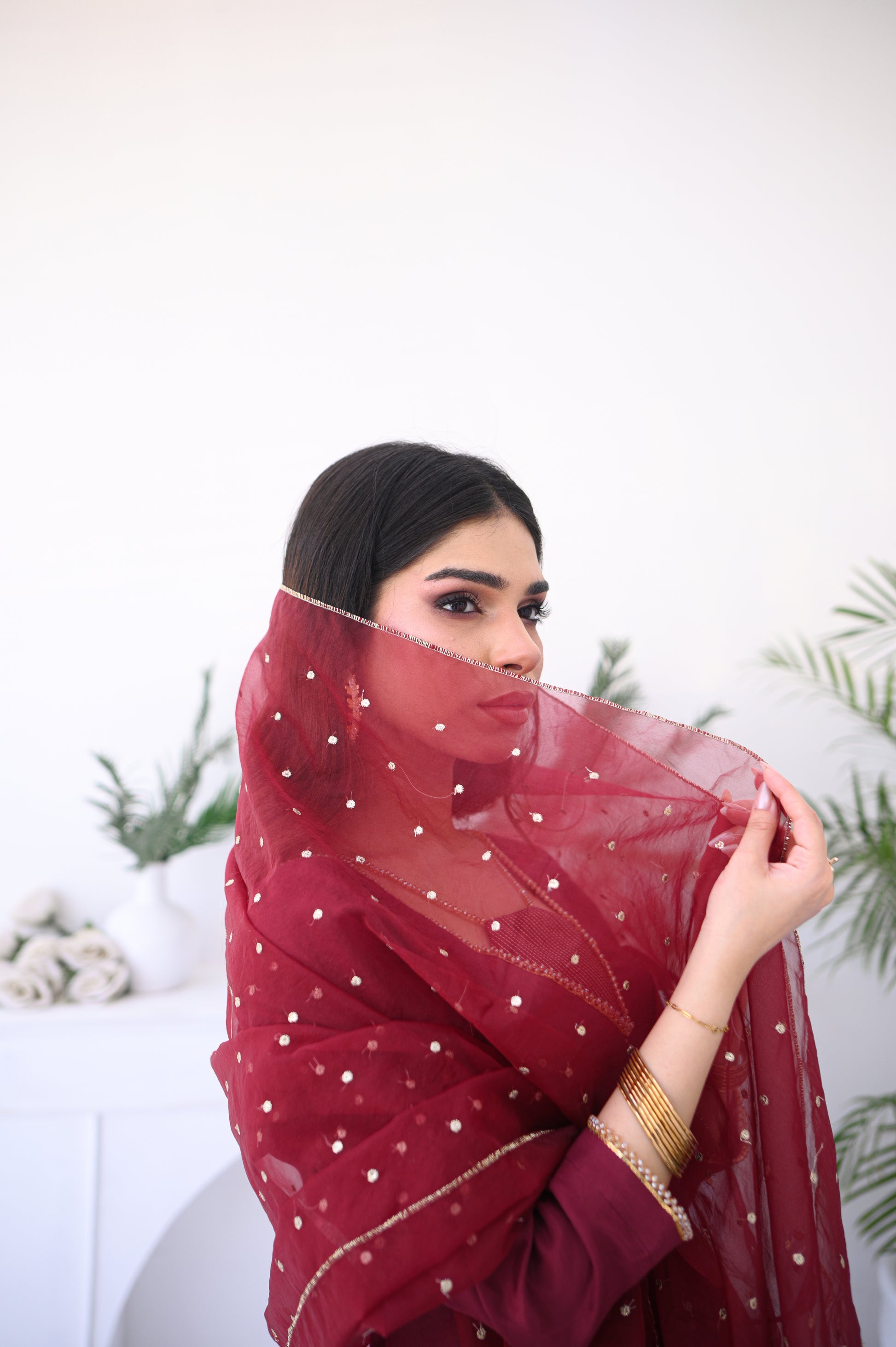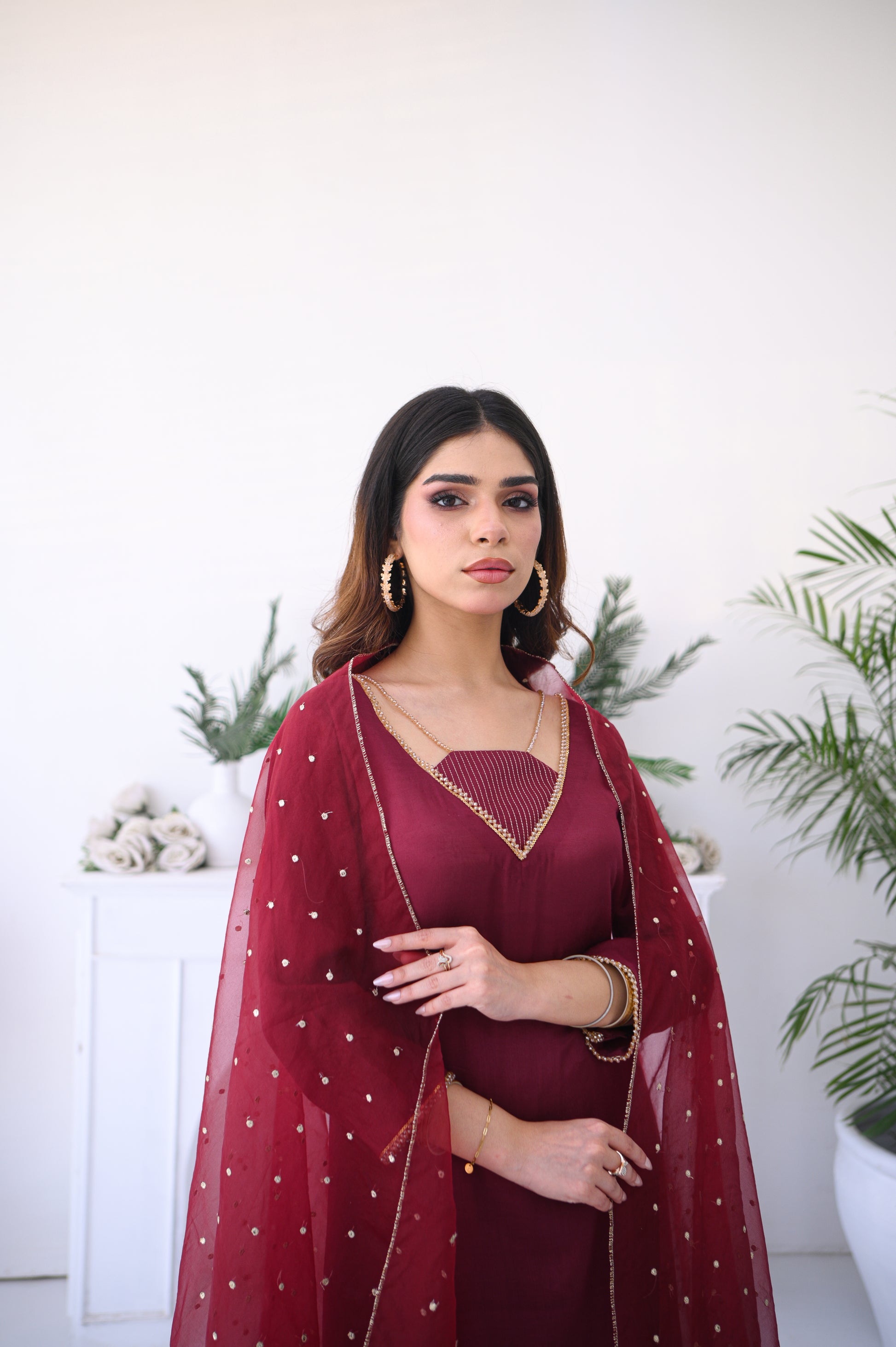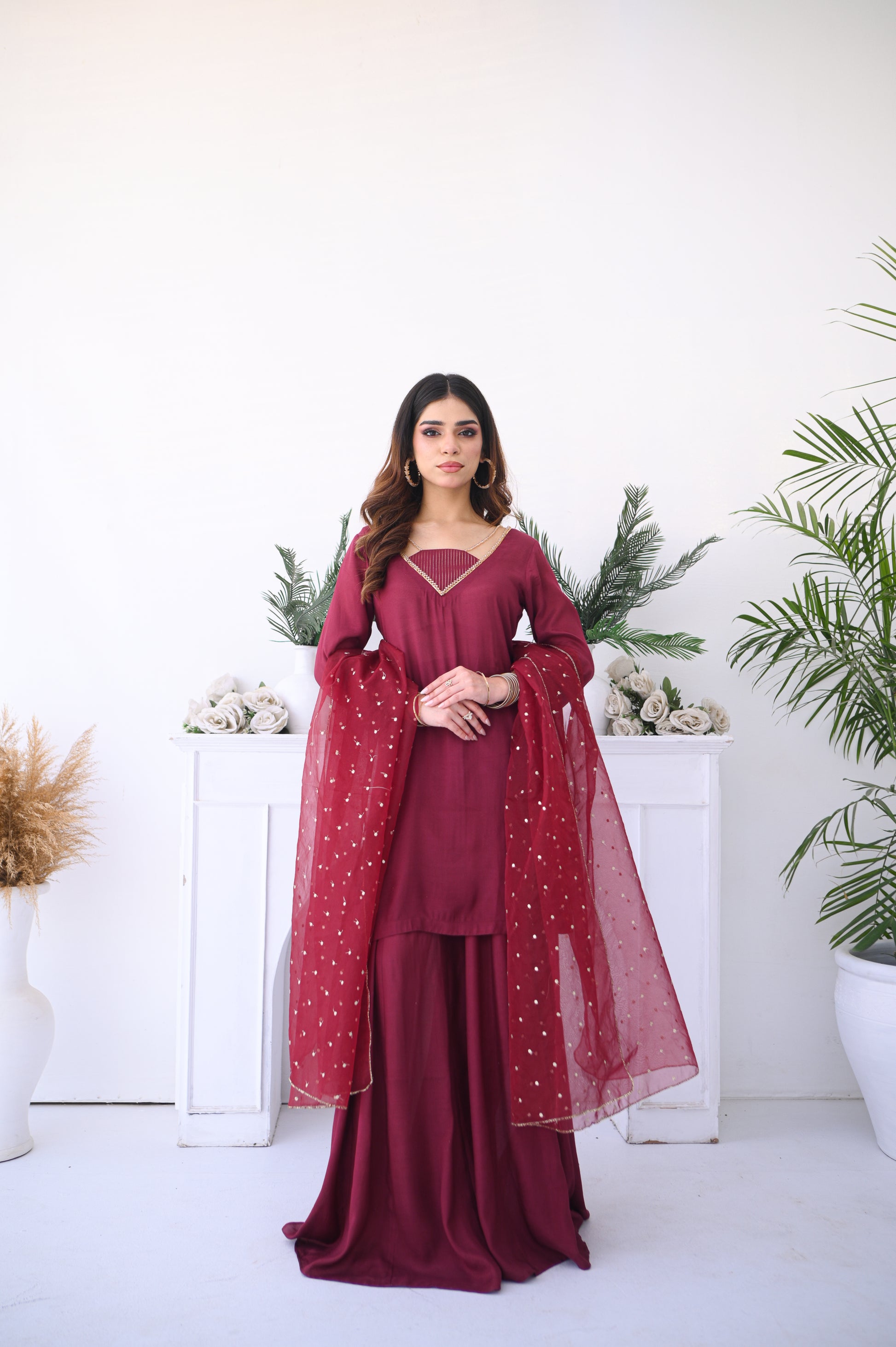 A delicate three piece article featuring short shirt with details on neckline paired up with flared pants and an embroidered organza dupatta.