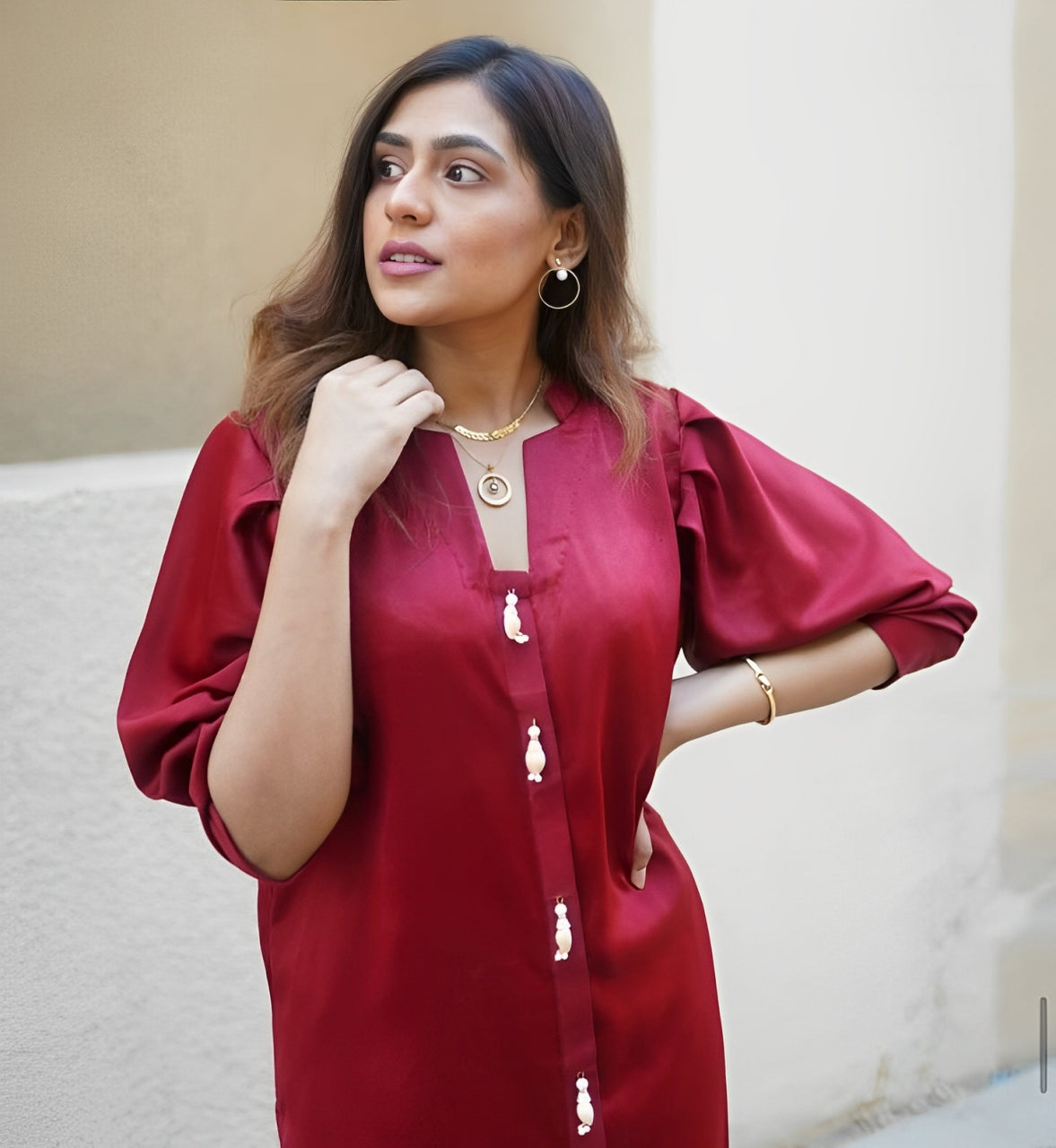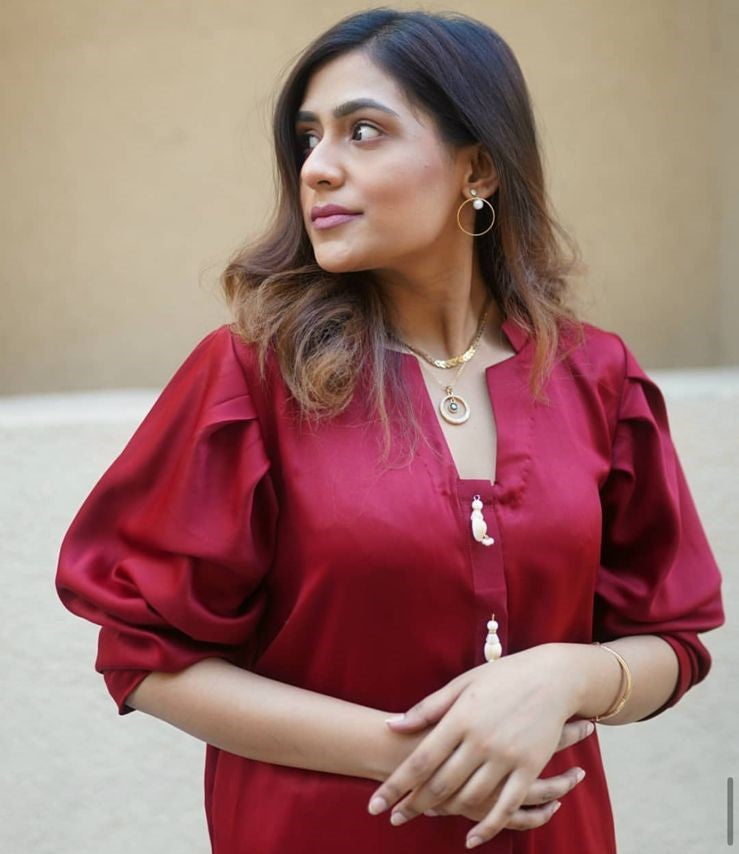 A two piece dress with pleats on sleeves.