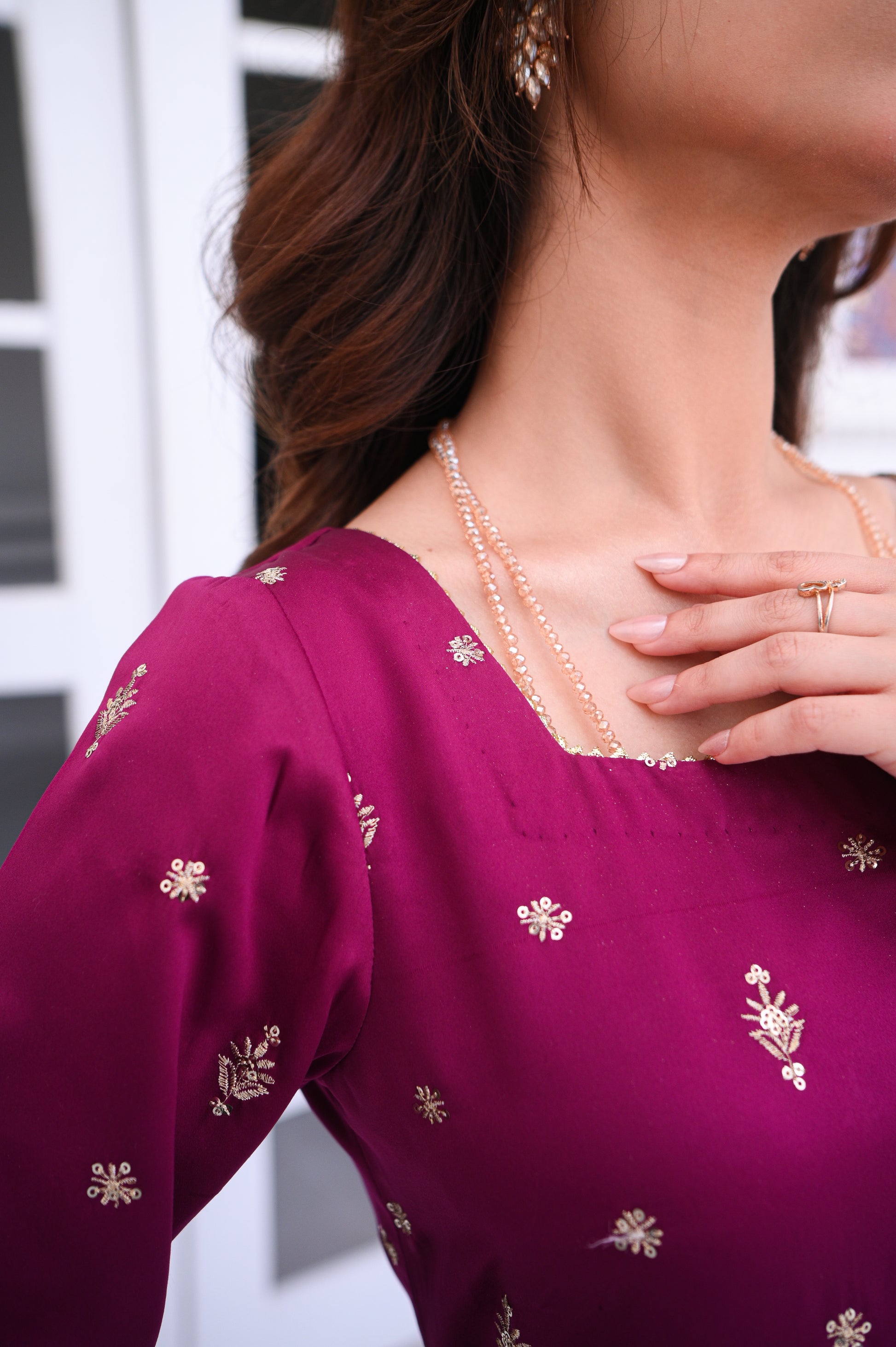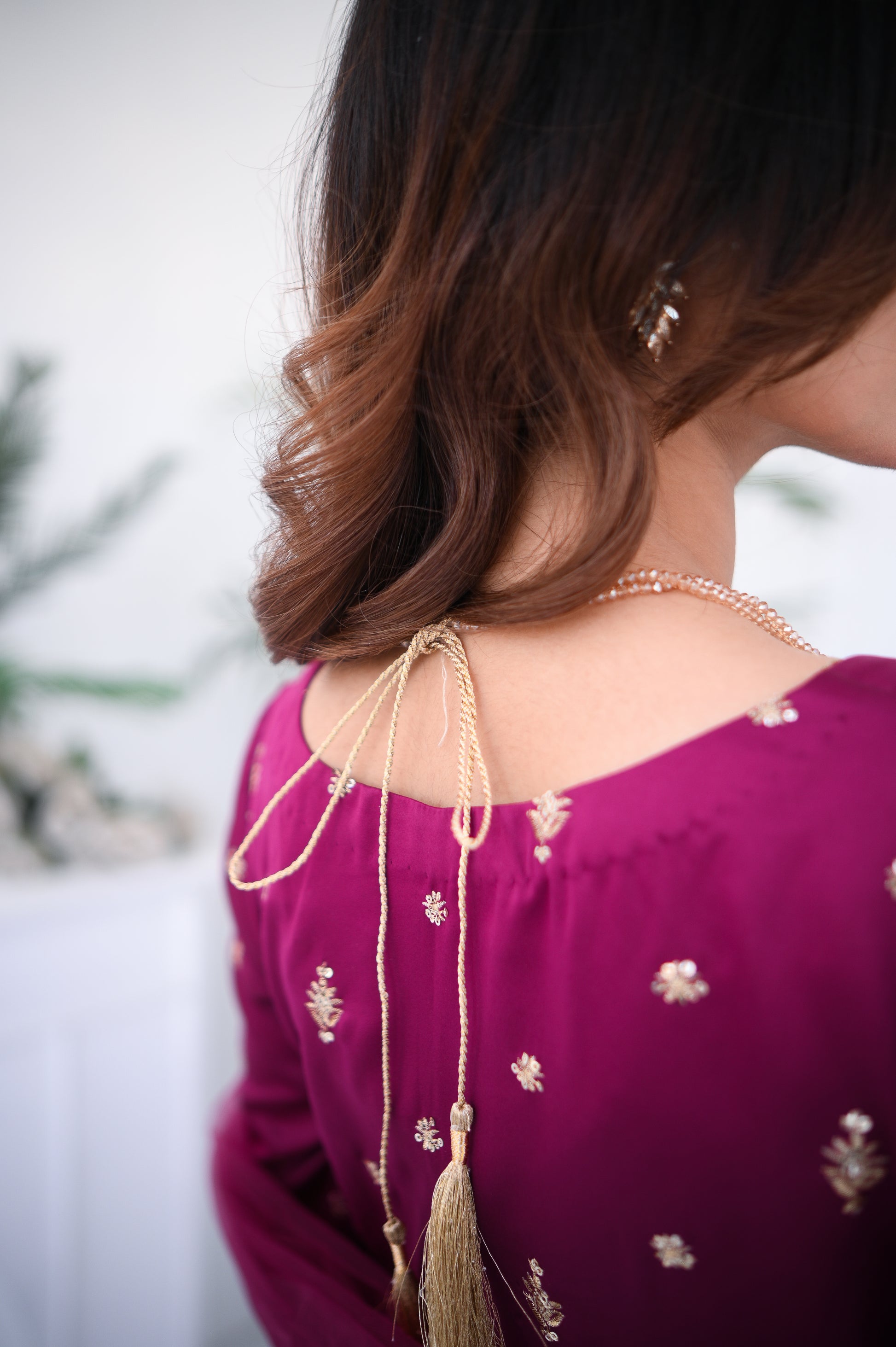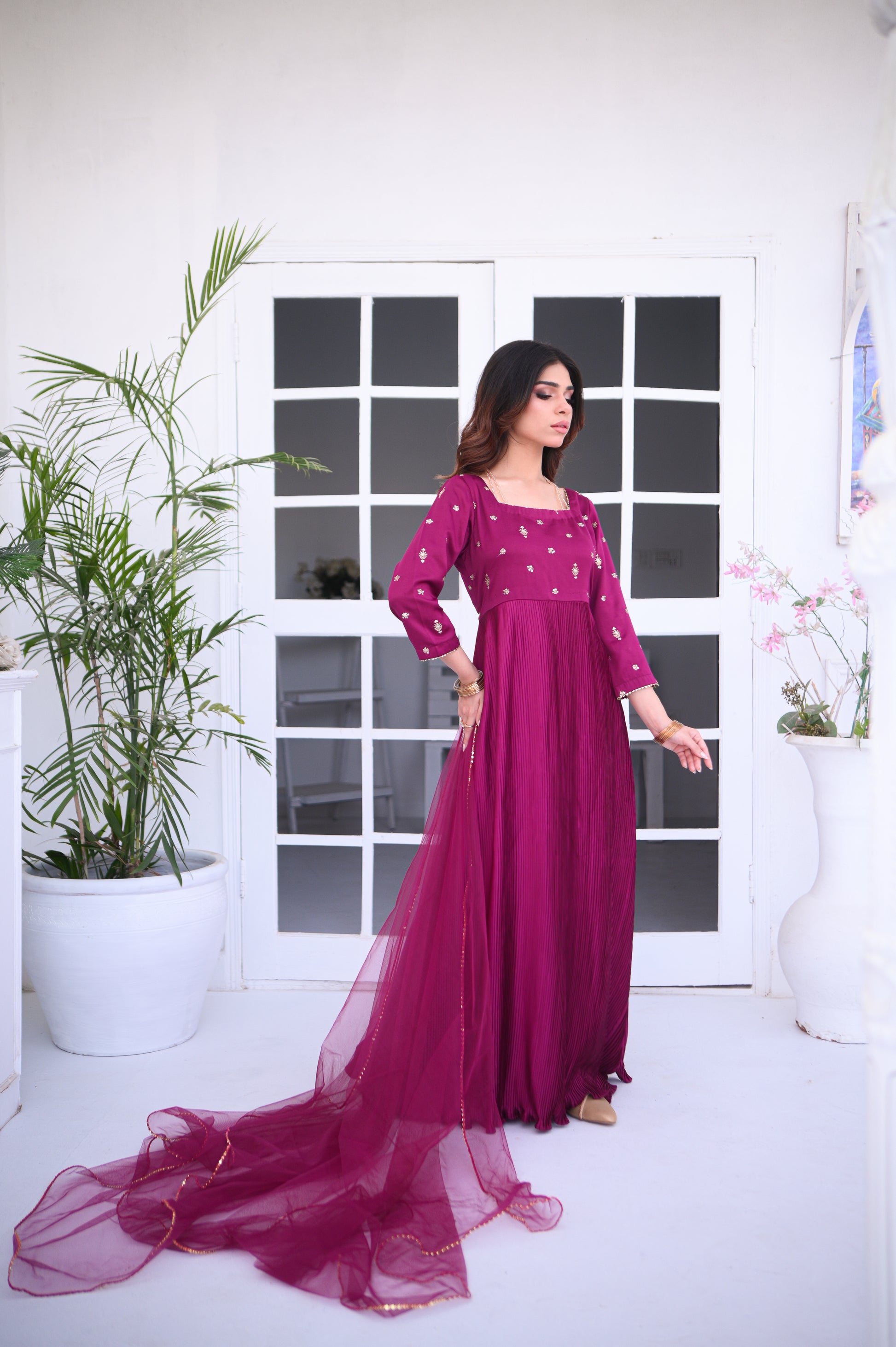 This ensemble featuring Crush fabric long maxi style frock with crystal detailing on neckline paired up with matching net dupatta.